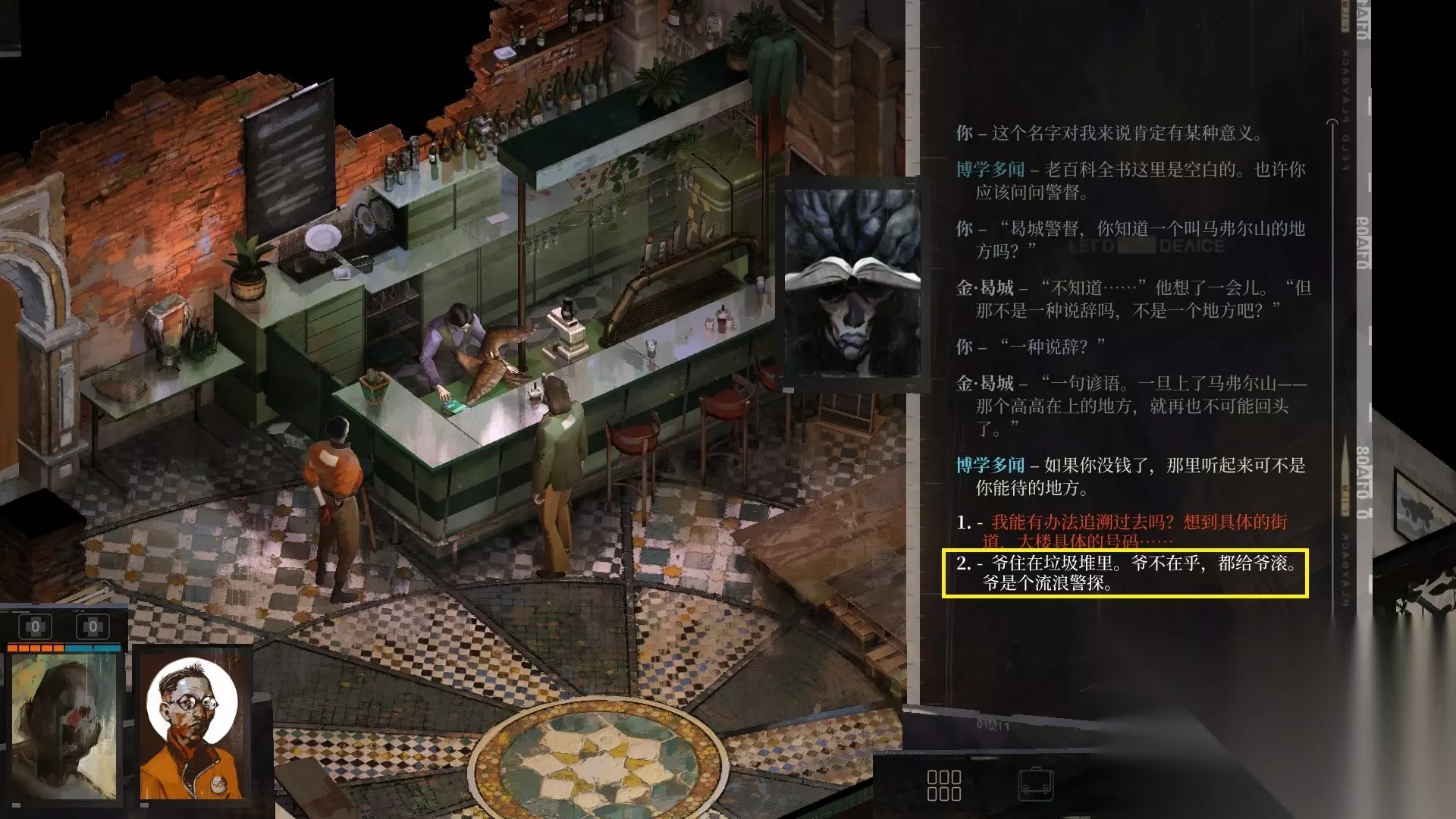 之后立马会跳出一个思维蓝点,点击开始发展思维,选择“我真的有家吗?”→“这个名字对我来讲肯定有某种意义”→“金警官,你知道一个叫马弗尔山的地方吗?”→“一种说辞?”→“爷住在垃圾堆里,爷不在乎。都给爷滚,爷是个流浪警探。”