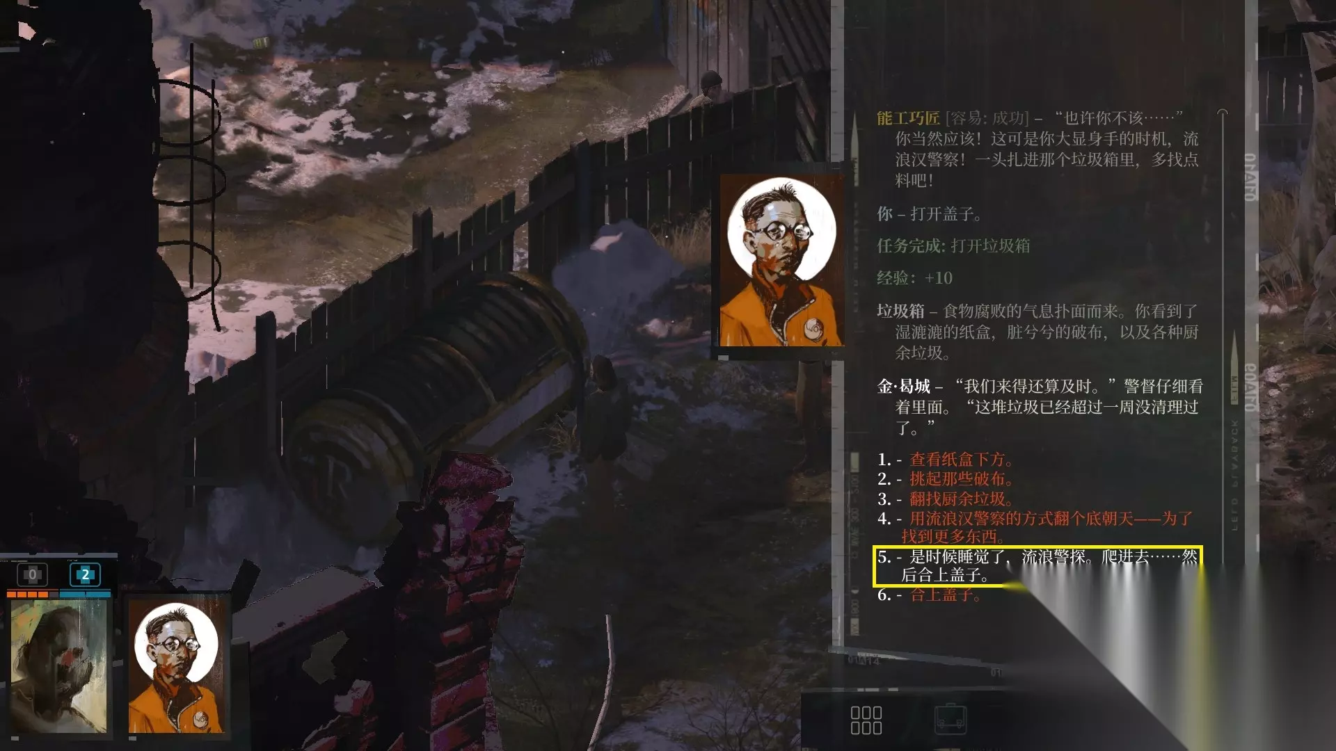 完成后,前往垃圾桶。垃圾桶在库诺和女孩之间的位置,与垃圾桶对话。如果运气好,你可以赤手空拳打开垃圾桶(这就是为什么选择肉体派的原因),如果运气不好,用警官的撬棍打开,或者返回褴褛飞旋找经理拿垃圾桶的钥匙。打开垃圾桶后对话,选择“是时候睡觉了,流浪警探。爬进去......然后合上盖子。”