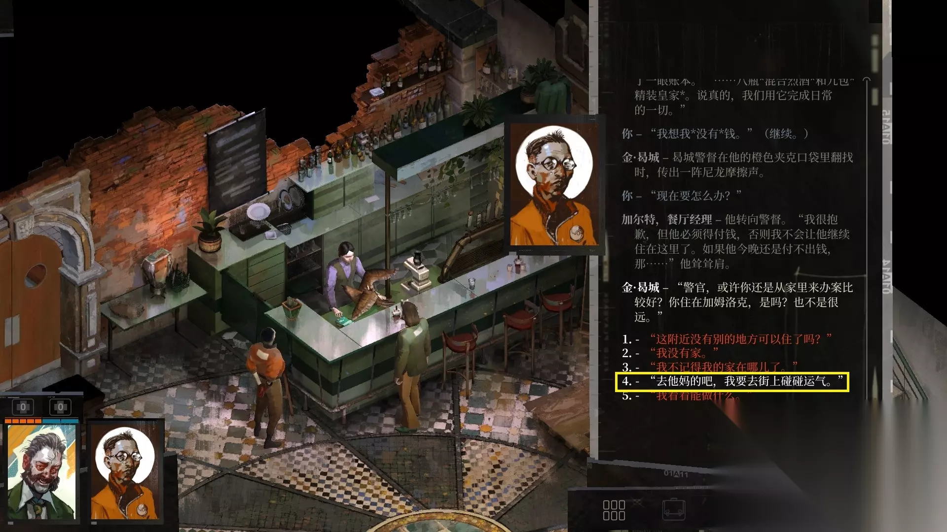 完成开始步骤后,直接下楼与金对话。对话结束后与餐厅经理加尔特对话。讨论案情过后加尔特会告诉你你需要还房费。金提出让你回家,选择“去他妈的吧,我要去街上碰碰运气”。