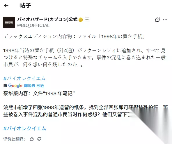 在生化危机9:安魂曲宣传周期临近尾声之际,卡普空悄然揭晓了一项出人意料的举措,旨在进一步推动豪华数字版的销售。 游戏官方平台陆续发布信息,详细说明选择数字版本的玩家所能获取的专属内容。此前,玩家普遍推测这些文档将延续系列传统,以类似生化危机:村庄中“贝克事件报告书”的方式,承担拓展世界观与叙事背景的功能。但最新披露的信息表明,它们远不止是静态的设定补充。 这批信件真实散落于浣熊市灾变发生前后的街头巷尾。完整收集四封,即可解锁一枚独特护身符。当城市秩序崩塌、恐慌蔓延,普通人在末日阴影下的所思所感,以及他们仓促留下的话语与牵挂,正透过这些泛黄纸页悄然浮现。