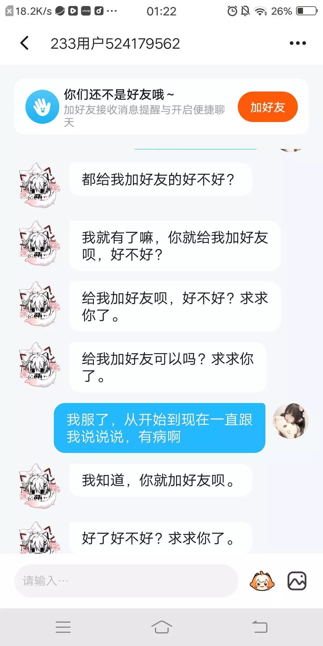 一直加我好友,我不同意他一直加,加不 到还破防,骂你你就受着呗