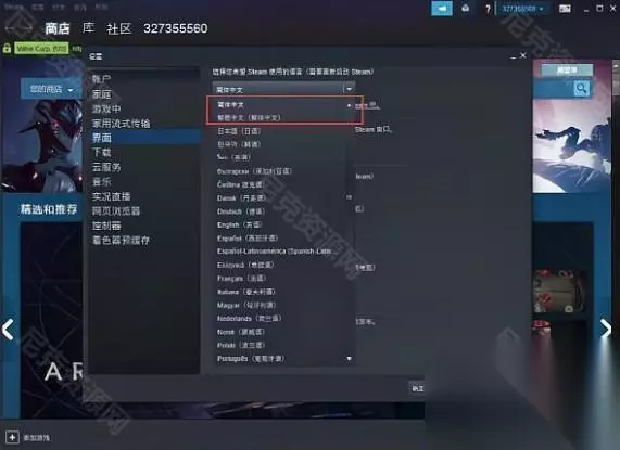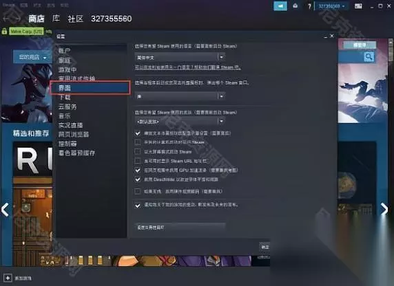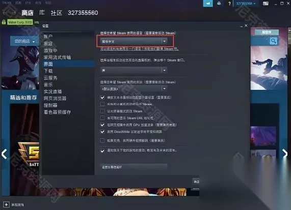 ④、随后,在弹出页面中点击“接口”,然后找到挑选您要使用Steam的语言,如下图所示,然后进入下一步。