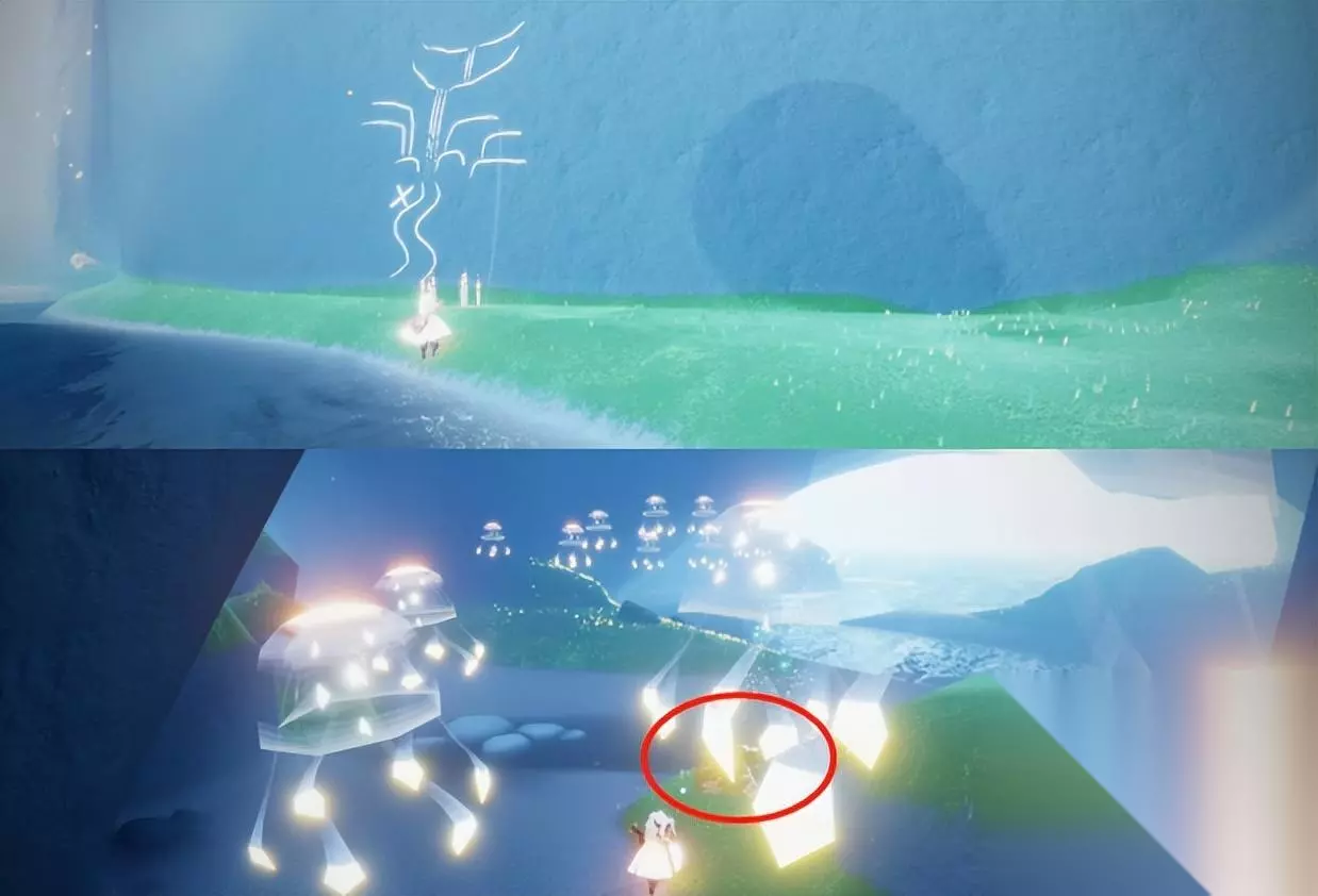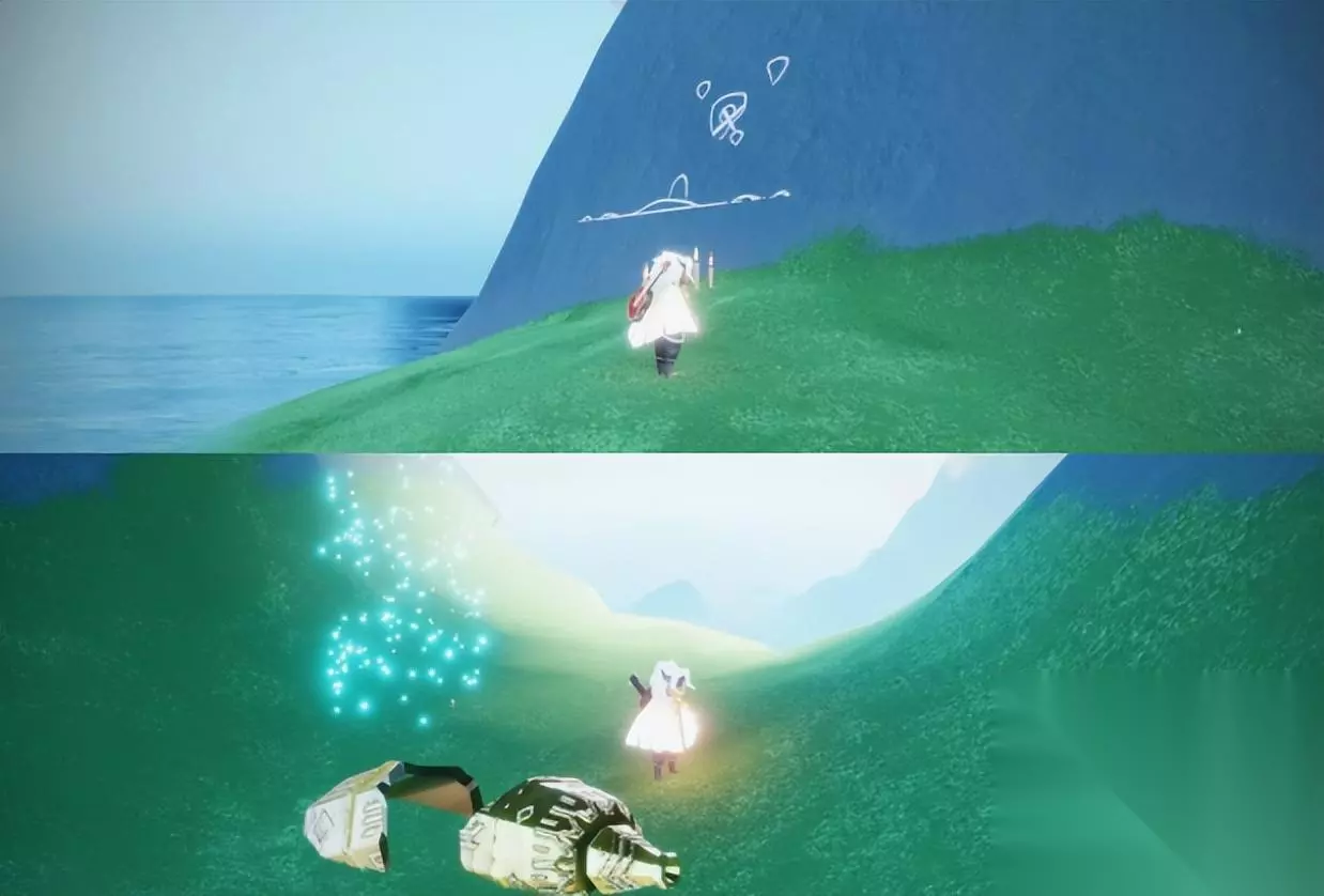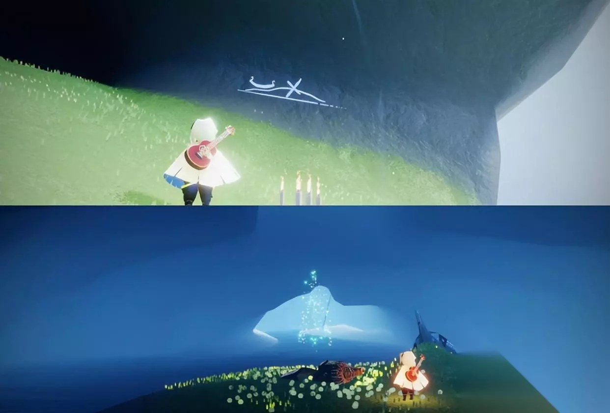 第三个任务:我们接取到第三个任务之后,前往第一个任务钟的地方的瀑布的右边就能看到蜡烛,点燃之后看壁画,提示我们钟在瀑布下面的水流处。 看完之后我们前往瀑布池下方的山洞里地下就可以看到第三个任务的钟,大叫然后拾取即可,然后回去找先祖,完成任务,获得一颗爱心。