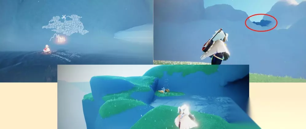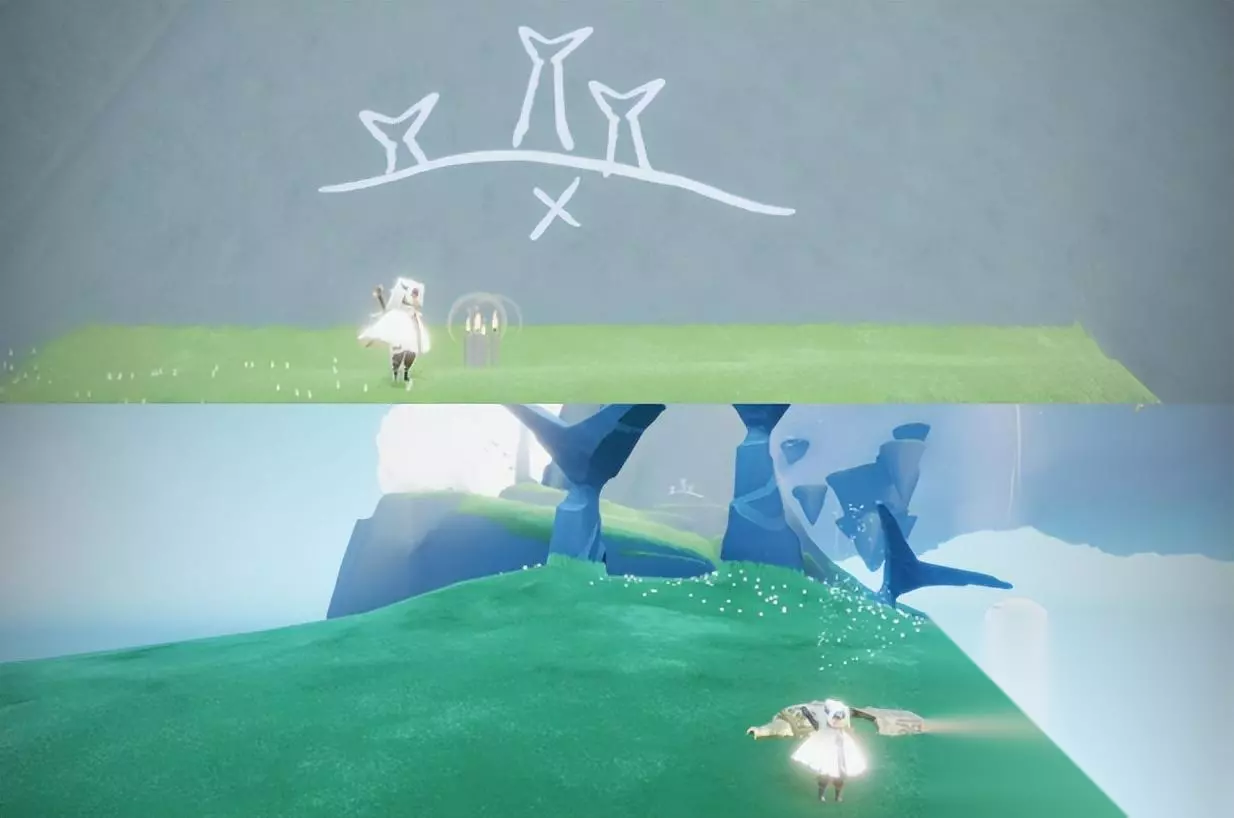 第二个任务:我们接取到第二个任务之后,往岛的右边走,走到看到一个会喷气的小岛之后在它的左边的大石头岛上,点燃蜡烛看壁画,提示我们钟在浮空的石头中间。 看向左边天上的几个大浮石,往中间镂空的那个浮空石岛飞,在中间就可以看到第二个任务的钟,大叫然后拾取即可,然后回去找先祖,完成任务,获得一颗爱心。