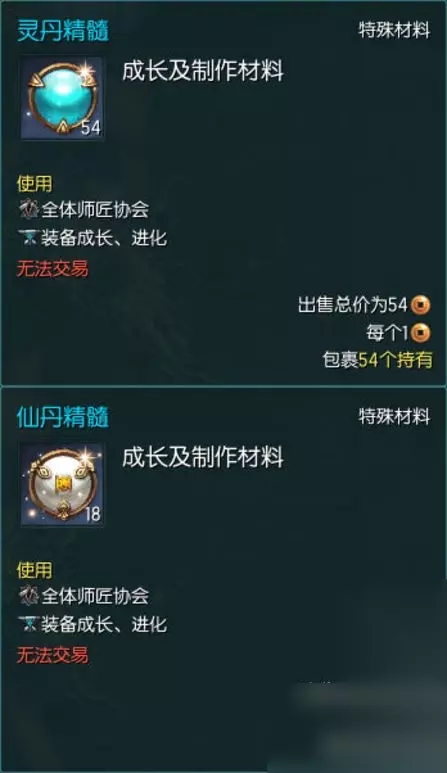 上图的两个道具是主线任务给的,目测是需要灵丹和仙丹合成的道具,具体用途嘛,看今后的更新吧。