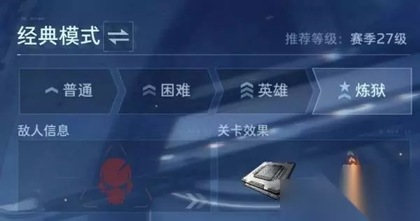 玩法奖励 经典模式首通可以获得NZ券和钛金迁跃秘藏,此外普通难度还有概率获得随机史诗级武器和蓝色插件,困难难度有概率获得随机史诗级武器和紫色插件,英雄难度有概率获得传说级武器和金色插件,炼狱难度在英雄难度奖池的基础上,还能获得塔防科技点,可以用于研究陷阱。