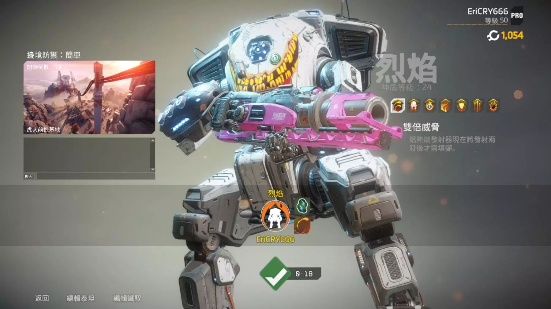 这是《泰坦陨落》的大师难度边境防御模式游戏内容,玩家选用帝王泰坦,看到队友选了三个烈焰泰坦后,预判这局战斗会很顺利,视频呈现了该对局的战斗过程。