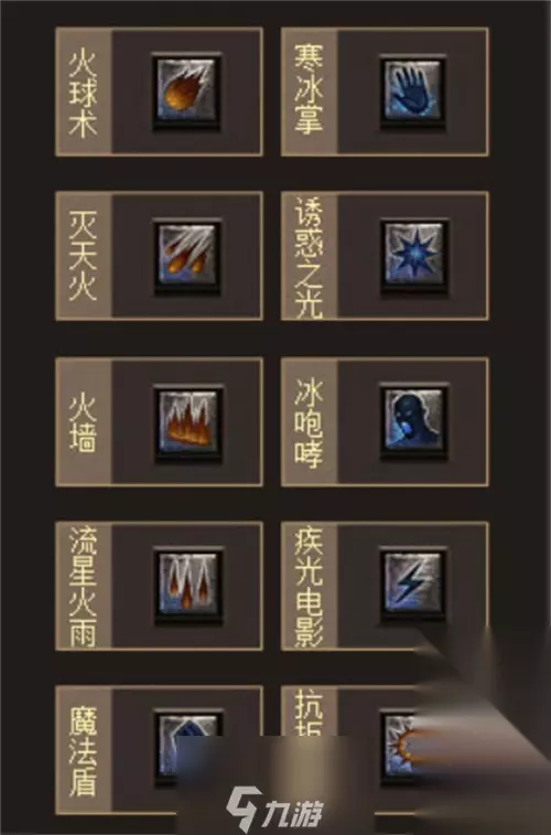 法师系技能:火球术、灭天火、火墙、流星火雨、魔法盾、寒冰掌、诱惑之光、冰咆哮、疾光电影、抗拒火环