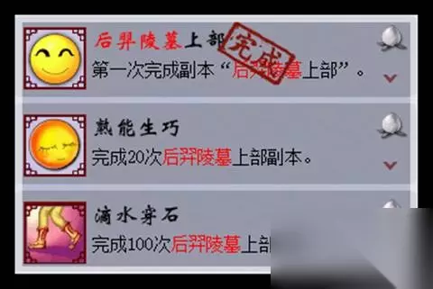 小编点评:最后三个成就任务是完成后羿陵墓上部副本次数的成就,分别是1次、20次和100次,总共3点成就点。需要少侠们日积月累才能获得哦。
