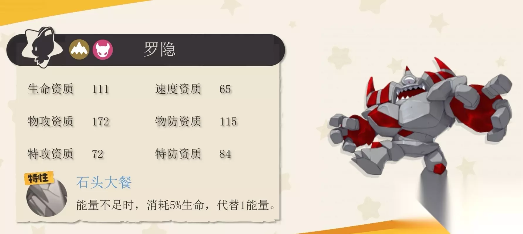 此外,恶魔狼本身就是速度型精灵,它在战斗中可以轻松抢到先手地位,能够提升己方的作战优势。小编推荐玩家按照控制+输出的思路给它配招,例如:【死神契约】、【黑暗气息】、【恐吓】、【思念头槌】就是一个很不错的搭配哦~ 推荐三:罗隐,它是由阿米亚特进化而来的精灵,在进化之后,发生了极大变化,拥有了十分强悍的实力,罗隐拥有能够在能量不足时消耗自身生命值代替能量的特性。它的物攻目前算是游戏里天花板级别的,实战效果十分惊艳。