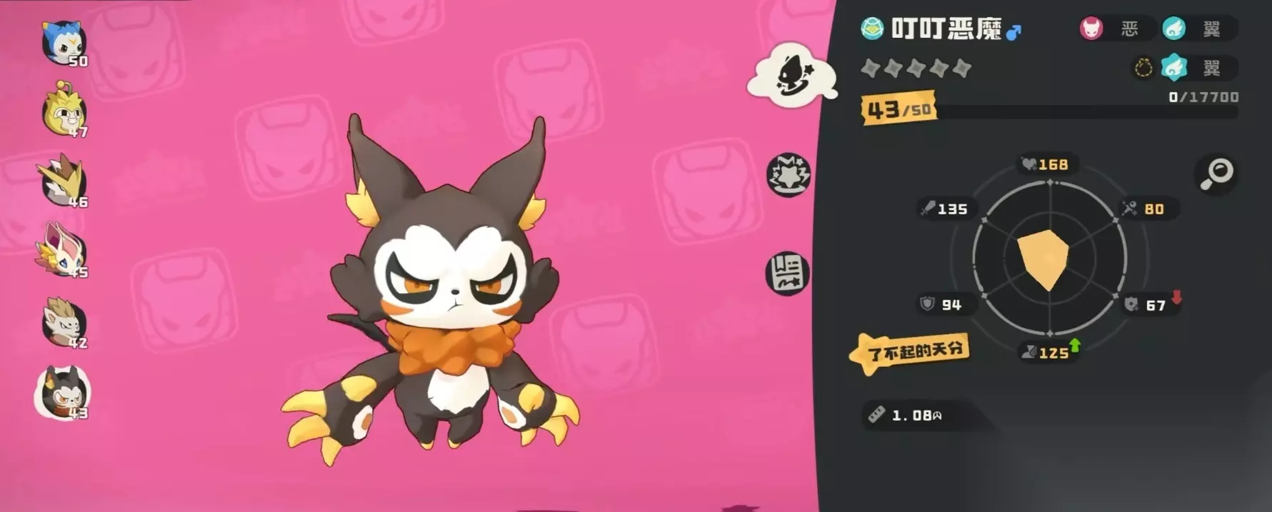 推荐一:叮叮恶魔,这是一只兼具了攻击力与速度的宠物,它的最终进化形态能够让自身的物理攻击属性得到极大提升,十分厉害。在战斗中,叮叮恶魔能够在造成伤害时按比例降低敌人攻击力,下次的攻击威力直接翻倍。其实玩家可以去利用它的优势,来实现叮叮恶魔的快速打击,从而造成多重伤害,不过由于叮叮恶魔的抗性较差,因此容错率有所降低,所以大家在培养它的时候要注重强化生命天赋,合理地分配技能、时刻注重能量回复才行。