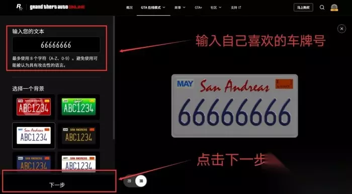 新建自定义车牌订单 输入自己喜欢的车牌号 然后点击[下一步]