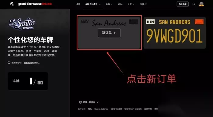 《侠盗猎车手5》线上模式自定义车牌教程 自定义车牌的功能原来是在一款安卓app——《iFruit》上,这款软件的优化一言难尽,后来R星下架了这款app,并在官网重新开通了自定义车牌功能,使得改车牌功能更佳便捷。后来R星又暗改了一波这个改车牌功能,现在改车需要开着指定车辆进入改车王才能完成订单,下面就教兄弟们方法吧。 点击 R星GTAV自定义车牌官网 然后点击[新订单]新建自定义车牌。