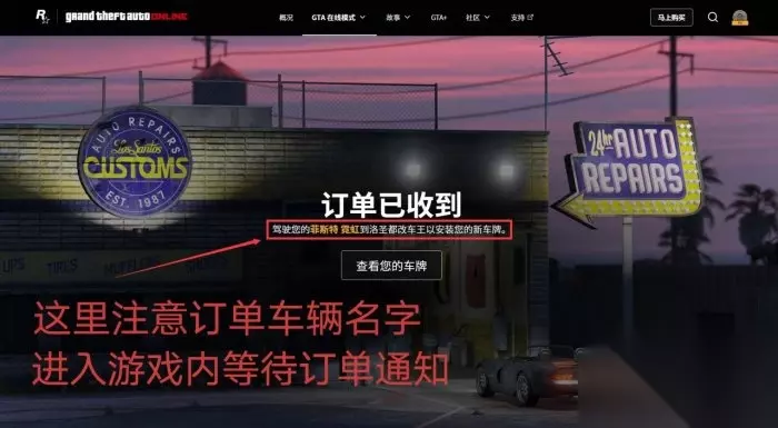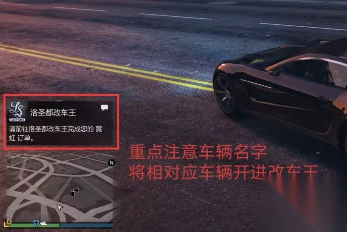 订单 注意此通知里的车辆名字,将车辆开进[洛圣都改车王] R星暗改的点就是这个,必须开此通知内相对应的车辆进改车王才能完成订单
