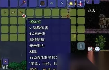 不过击退力一般是对于小怪而言,除了某个吃击退的boss。最后总结一下,迷你鲨需要只要26个金币购买,可以使用到克脑或世吞。但相比于获取更早的火枪、夺命枪、三发猎枪来说,伤害并没有优势。在大前期百废待兴的情况下,26的价格并不是一个小数目。