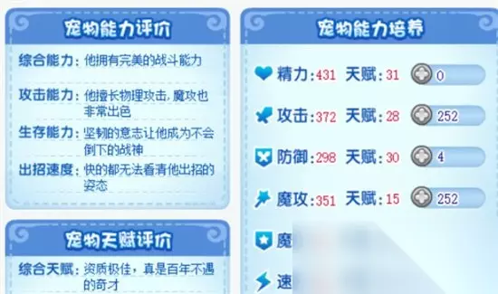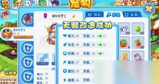 2.开心豆道具洗天赋效果介绍 使用开心豆道具更改天赋是洗天赋的方法之一。游戏中的宠物一共有着精力、防御、攻击、魔攻、魔抗和速度这六种天赋。通过使用开心豆可以将宠物的现有天赋进行随机的重置。这个随机天赋是有一定的范围的,可以更改现有值的1-5点,是随机更改的,效果不是很稳定,有一定的运气成分。