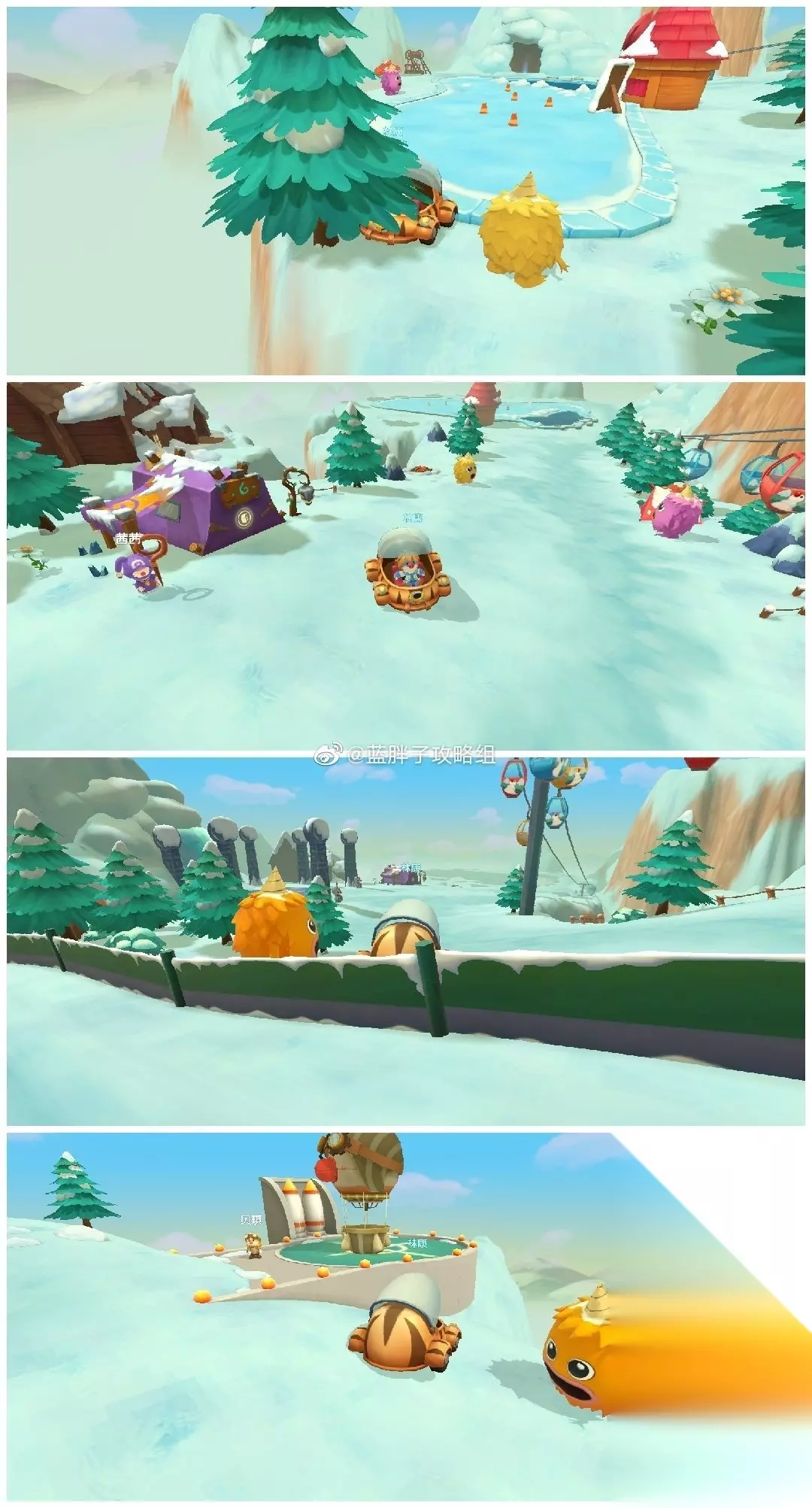 【拉雅雪山毛毛头位置】 1、紫色毛毛头在池塘边上。 2、黄色毛毛头溜冰场边上。 3、另一只黄色毛毛头在魔法小屋左边。 4、紫色毛毛头在魔法小屋对面。 5、橙色毛毛头在滑雪赛道边上。 6、另一只橙色毛毛头在热气球边上。