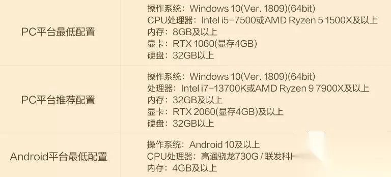 因为是多端的游戏,这里先来看移动端,安卓平台最低需要安卓10及以上系统,处理器最低骁龙730g,运行内存需要4GB,没有提到具体的存储空间需要多少,参考PC端的32GB存储空间需求,移动端对半吧,建议预留至少16GB的空间。