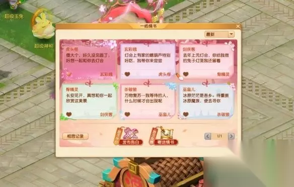 一纸情书活动 活动时间 2025年2月13日12:00-2025年2月16日12:00 参与条件 等级≥30级,单人 活动背景 一纸情书,两心相契。情人节是表白的大好时机,情缘仙子在三界设立了表意墙,供世间男女传情达意。若是暗藏心事,不妨借此机会一诉衷肠;若有甜蜜伴侣,也可秀个恩爱羡煞旁人。 活动介绍 1、前往长安城(250,109)找【情缘仙子】选择【一纸情书】即可参与活动; 2、【寄送情书】可以发送传情信件,每日首次发送信件免费;