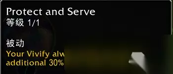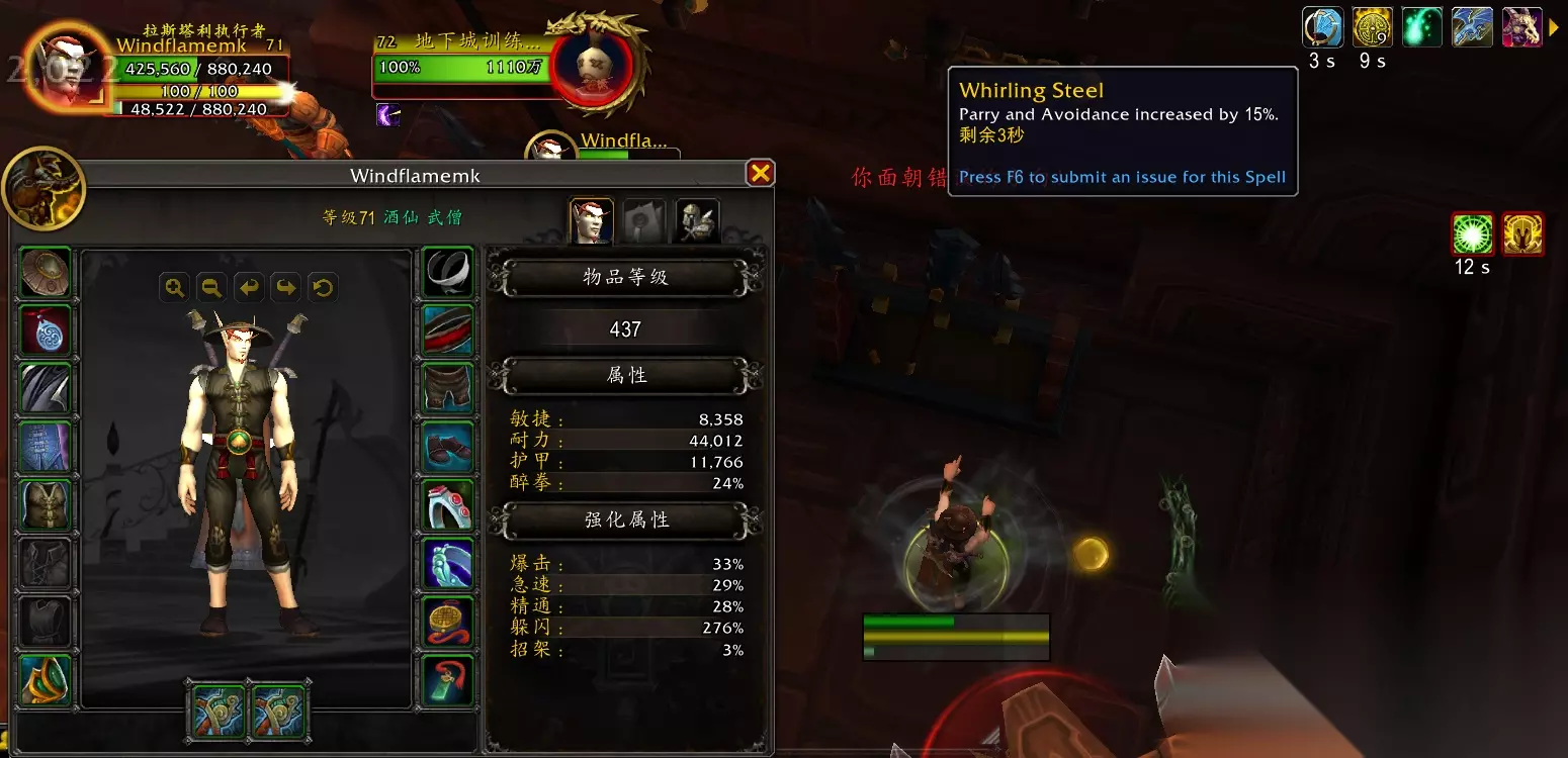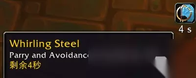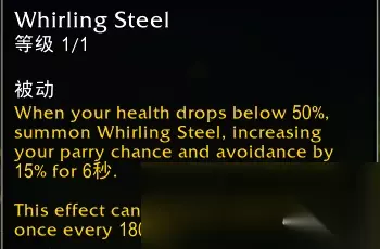 效果翻译(仅酒仙专精部分): 当你生命值低于50%时,召唤回旋钢铁,提高15%招架和闪避,持续6秒。 这个效果每180秒只会触发1次。