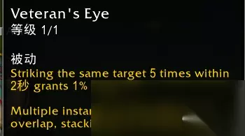 效果翻译(仅酒仙专精部分): 被疾风打击攻击过的敌人如果在5秒内死亡,会对8码范围内未被控制的敌人造成X点物理伤害。 无测试点,该效果目前无debuff提示。 2-2.老兵之眼 −老兵之眼 ... 天赋说明