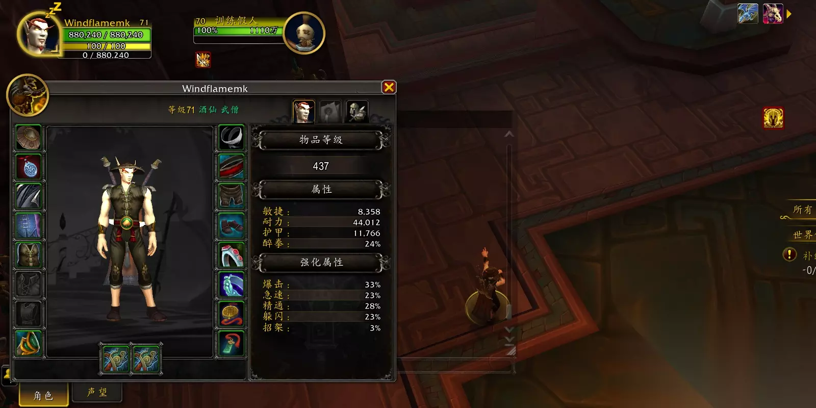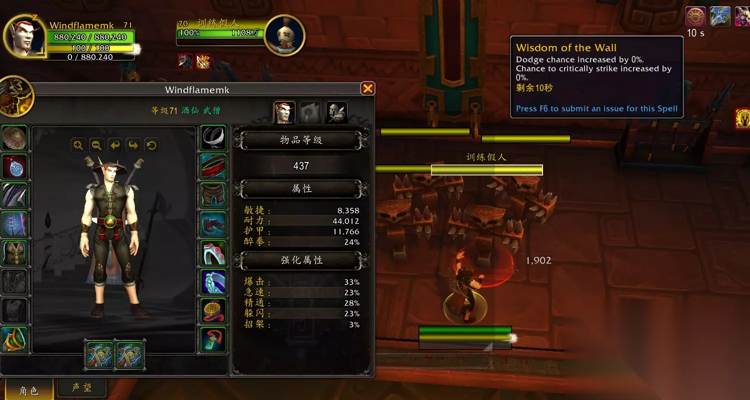 效果翻译(仅酒仙专精部分): 累计造成等同于你最大生命值100%的伤害将获得1层疾风充能。 每消耗400能量,释放所有疾风充能,每层造成X点物理伤害。 buff 首先穿着装备打出约30W伤害,然后脱掉装备,血量上限降低到27W。