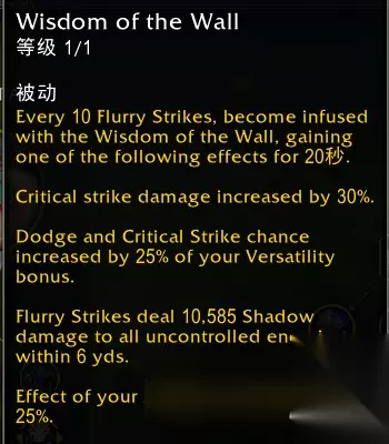 效果翻译(仅酒仙专精部分): 每施放10次疾风打击,被下列一种长城智慧强化,持续20秒。 1.你的暴击伤害提高30% 2.你的全能的25%现在也会提高你的躲闪与爆击 3.疾风打击现在会对6码内没有受到控制的敌人额外造成X点暗影伤害 4.你的精通效果提高25% buff 每次随机抽选buff(确认不会按照固定顺序获取),每种buff都会持续20秒,与描述一致。 所有buff都会在本次疾风打击之前获取。
