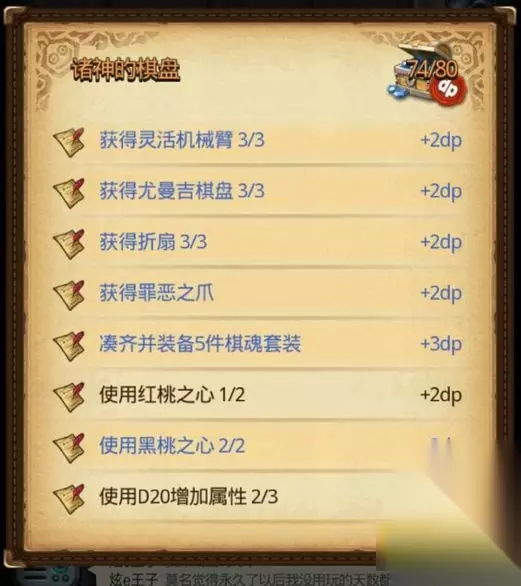 DP攻略 这个诸神之卷是棋盘地图的法术卷轴,效果好像是减少怪物50%的血量。 诸神之卷DP获取途径 1.铸造琥珀雕像机率取得 2.大盗神能捡到一张 3.分支二路线 分支二路线指的是:不走献祭流会遇到受伤的旗子,给他对应装备可能给 其实主要就是融合琥珀,其他两个途径可以忽略,不过差一两个可以用 诸神棋盘的DP要求玩家使用诸神之卷10次,所以想要一次完成还是比较难的,多刷几次迷宫就可以做完了。 神之卷是诸神棋盘迷宫中的DP之一,大家使用10次这个法术就可以完成了。