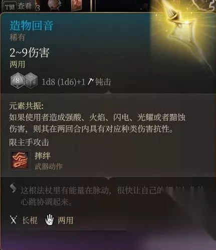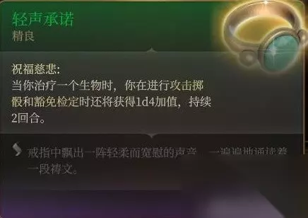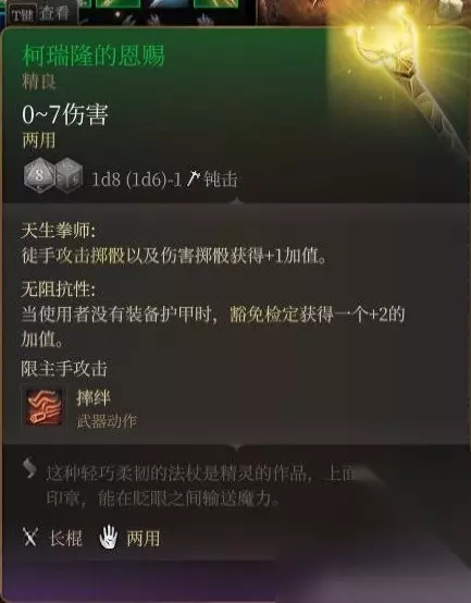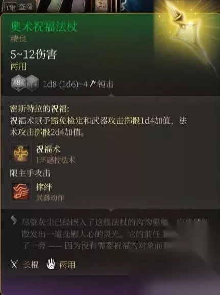 传说中的显示bug杖 第一次看见描述和两个buff图标的时候,我以为这玩意能让队友变超人,然而并没有。 效果描述和医师手套一样模糊不清,只是额外提供给了法术攻击掷骰2d4加值,并没有在原祝福术的基础上给予豁免及武器攻击1d4。 想想也是,一个祝福术就有2d4豁免和2d4攻击掷骰确实有点逆天了,但这描述能不能改一改。 另外这杖的bug也还在,祝福断了专注之后,1d4豁免和武器1d4加值会消失,但法术的2d4加值仍然存在。