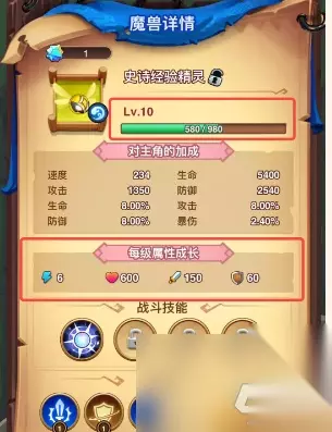 魔兽属性 魔兽可以为主角提供大量的属性,分别是上阵加成和图鉴加成,上阵加成还分为基础属性和额外属性词条,通过消耗经验精灵可以提升基础属性的等级。额外属性词条在获得魔兽时随机生成。图鉴加成在第一次获得魔兽时就生效了,在图鉴和外部界面可以看已获得的总加成。 魔兽技能 每个魔兽都有自己专属的主动技能,而且是固定的,不需要等级。超凡级魔兽有两个战斗技能。魔兽在释放技能时,既可以给对敌方造成伤害,还可以给主人增加特殊的增益效果。