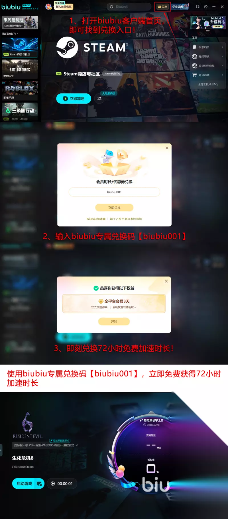 biubiu加速器作为行业内标杆级的加速工具,早就已经得到了众多玩家的一致认可,拥有丰富的免费加速时长可以领取。对新用户而言,在首次注册之后可以免费24小时。【biubiu001】是一个通用口令,所有的用户都可以领取3天免费加速时长。新用户可以叠加两种方法,那最后就可以免费长达96小时。为何这一款加速器会备受认可呢?第一,拥有帕拉斯3.0引擎,第二,是pero战队官方的合作伙伴。第三,拥有阿里巴巴灵犀互娱技术的支持。让大家在选择这款加速器之后,丝毫都不需要担心。
