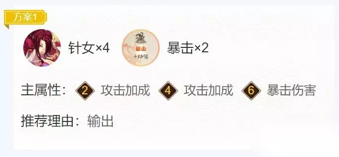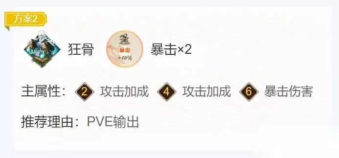 方案二:狂骨×4,暴击×2 御魂位置: 2号位:攻击加成 4号位:攻击加成 6号位:暴击伤害 点评 有着更快的攻击速度,能更好的叠被动。