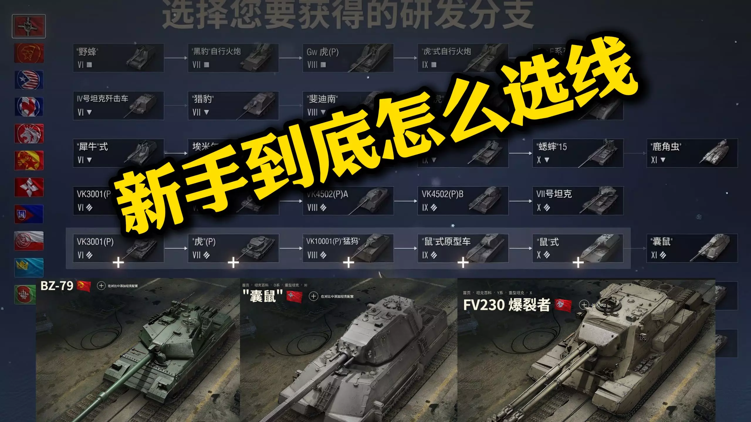 这是《坦克连》的新人入坑选线教程,展示了不同国家的坦克科技树,包括中坦、重坦等不同类型坦克的研发线路,还介绍了部分坦克的属性,帮助新人选择合适的坦克研发路线。