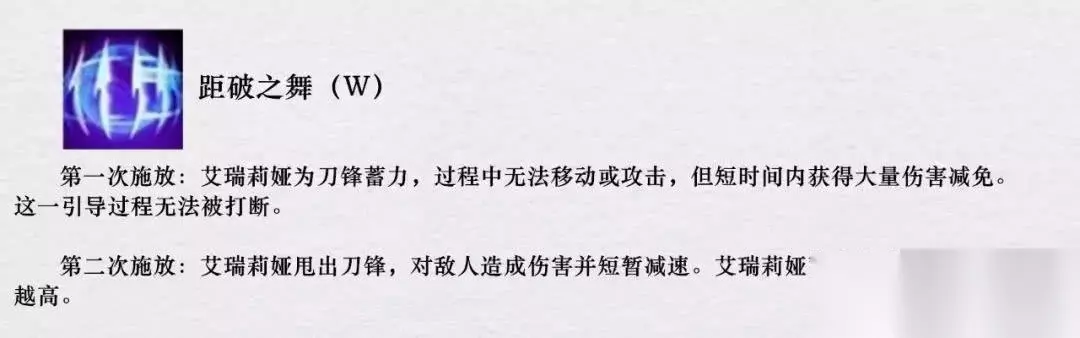 W技能是一个二段技能,第一段蓄力减伤,二段反弹伤害,使得刀妹可以规避敌人的同时打出强力反击。值得一提的是,这个技能减伤效果的强弱和刀妹AP属性多少有关,如果刀妹的AP达到一定程度时候减伤效果可以达到百分之百,和AP剑圣有异曲同工之妙。