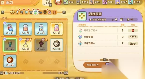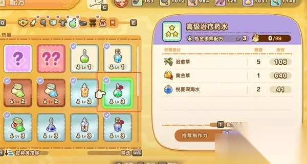 幻想生活i炼金快速升级方法 一、推荐配方:大恢复粉 → 治疗灵药 推荐理由:所需原料均可在商店或特定地点稳定购买,无需采集、打怪 极大成功经验加成显著,适合中后期冲级使用 二、准备阶段 治愈草:公会商店购买 黄金草:公会商店购买 悦夏深海水:公会商店购买 试炼洞窟水:公会商店购买 巨型松露:勇健岛餐厅购买 建议在炼金前先将上述材料批量购满,确保能够一口气完成整套流程,节省来回跑图时间。 三、炼金流程拆解 Step 1:制作大恢复粉 配方说明:基础恢复道具,合成门槛低 目标产量:至少制作40个(极大成功上限为99个) 推荐操作:使用炼金强化道具提高极大成功率