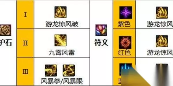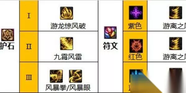 二、护石选择 1、护石通用搭配一 护石:游龙惊风破、九霄风雷、风暴拳/风暴眼,护符紫红游离之风、蓝色狂风冲刺。