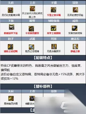 2、推荐方案二 武器推荐:胜负之役棍棒 防具推荐:支配者护肩+天才上衣+机械下装+千丝腰带+暗影鞋 首饰推荐:千音手镯+愤怒项链+双音戒指 特殊装备:光学眼镜+冰晶耳环+静谧之像 解析:特化CP武器带来的特色,将游离之风当做输出主力,强度高,偏续航,进阶必备自定义恩特肩,恩特肩必备非无色+15%词条,其次手搓技攻+12%。