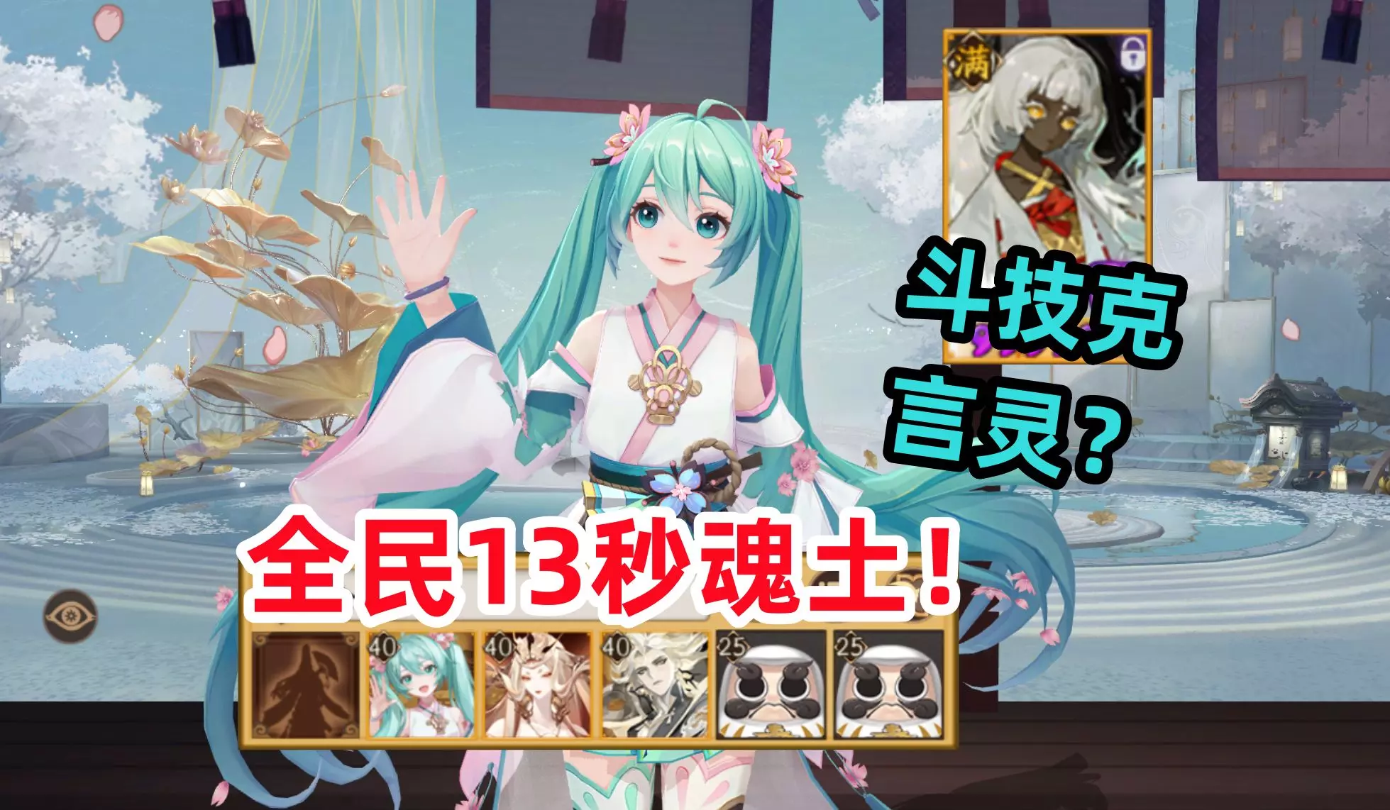 这是阴阳师的游戏内容,分享了初音未来搭配天照13秒通关魂土的最低面板配置,该狂骨鬼姬面板配置难度较高,也可带吞卷进一步降低配置,还提及收尾式神选动作快的。