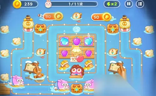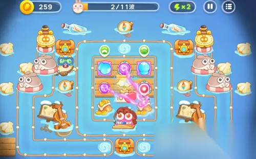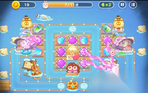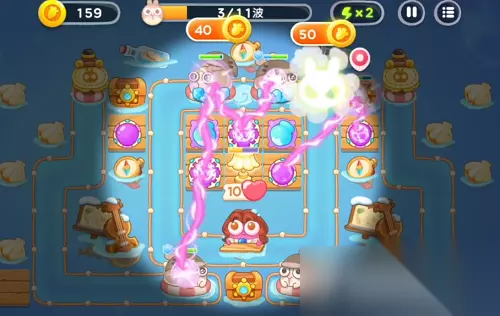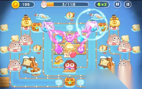 稳住第1波,第2波兔子速度不怎么快了,捣蛋兔就来了,抓紧升级魔法球,有多余的时间就打捣蛋兔,没有就先不管它。第3关滑板兔又来了,雪球炮塔可以先不升2级,继续在两侧建魔法球、雪球,减速、增加伤害量。这里优先把魔法球点满,雪球可以先放一放。