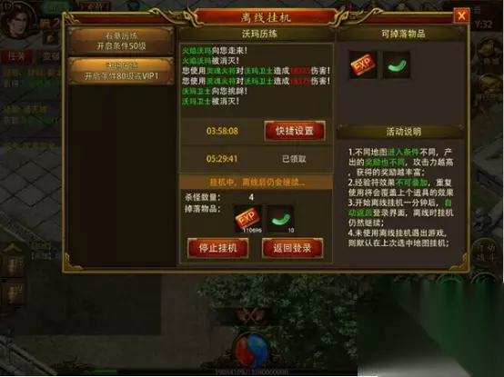 完成除魔任务就可以继续主线进行游戏了,可以把任务放在突破限制的时候再做。等级达到60级就可以开启离线挂机功能了,在这里可以使用经验符,VIP还会有多倍的离线挂机奖励 小技巧:现在全天都有双倍经验活动,在线的时候可以不用购买双倍经验奖励,但是离线前一定要购买喔,根据你离线的时间长短,可以选择购买4小时或者8小时的双倍经验,VIP1还可以提前去80级的场地离线挂机刷怪喔,可获得更多经验。 二、 回收装备