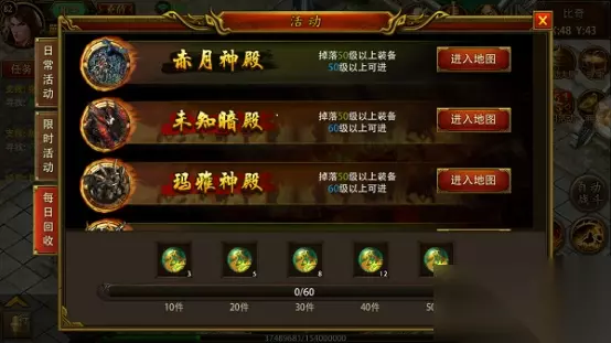回收装备在等级达到60级也会有提示,但是等到70级就会根据回收的装备数量开启每日回收,想要打装备就可以去刷各种的boss,遇上合适的装备就穿,不合适的就回收。 小技巧:等到70级开启的时候,装备回收会按照回收的数量奖励经验丹,主角可以使用,所以建议早期的引导回收的任务就不要去跟了,直接跳过。等到70级开启之后就可以在世界地图找到比奇城,坐标是x45,y57,也可以看着地图左下角的装备回收员跟着去,也可以在任务栏隔壁的提示回收装备连接进入。
