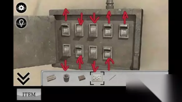 9、将开关处的开关依照答题卡的黑块按on和off。 10、来到有三个灯的这面墙,环顾四周,记录下来亮着的灯的方位。