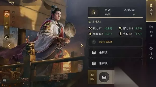 自带战法:【临机制胜】,指挥战法,敌我全体被施加异常状态时,有高概率对敌军随机两人造成谋略伤害,每回合最多4次,并且累计触发4次后,恢复我军全体兵力。 周瑜获取方式: 1.点击寻访:选择“招贤纳士”卡池寻访获得; 2.群雄逐鹿霸业阶段时,点击寻访,选择“雄姿英发”卡池寻访获得。 专属金色韬略: 1.《火计》:每个回合行动时有60%概率对敌军随机单体施加火攻,持续2回合。 武将缘分: 1.顾曲唱和