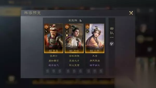 战法替换选择: 周瑜可选:料事如神 狂风大作 小乔可选:谈笑诛心 洞若观火 黄盖可选:坚壁清野 忘私相助 先攻顺序: 小乔>黄盖>周瑜 武将可选替换:
