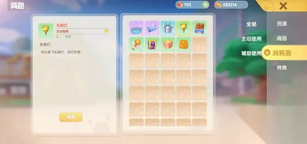2.进入背包,找到【消耗品】——【主动使用】,就可以看见刚刚获得的孔明灯。点击使用。