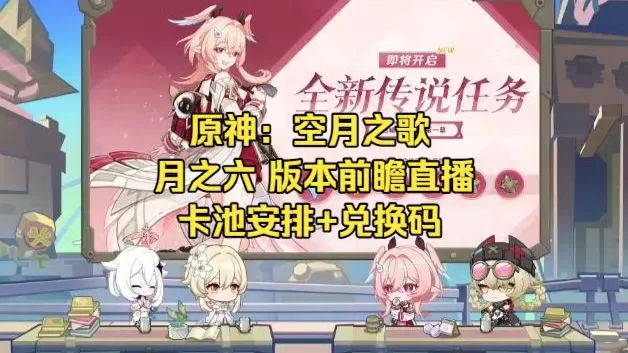 【原神】「月之六」版本前瞻直播原石兑换码&简报 「国服国际服」 「空月之歌·旋舞」——「逢归的谶羽」 兑换码 国服: 冒险大师莉奈娅 空之神殿大冒险 齐得龙咚锵 国际服: LinneaClassTime TempleofSpace Scaleblade 卡池 上半:莉奈娅 恰斯卡 下半:菈乌玛 奈芙尔 集录祈愿: 艾梅莉埃 克洛琳德 娜维娅 希格雯 林尼 国际服链接直达: https://genshin.hoyoverse.com/en/gift?code=LinneaClassTime https://genshin.hoyoverse.com/en/gift?code=TempleofSpace https://genshin.hoyoverse.com/en/gift?code=Scaleblade 兑换方法: 游戏-设置-账户-兑换码 请于3月30日午12:00前兑换逾期失效 全新角色:莉奈娅(弓 岩) 全新武器:弓 · 霜结的誓金技 全新传说任务:莉奈娅 启喻鸟鸣之章 第一幕 全新地图:荆夫港 空之神殿 全新怪物:守望者 梅兰塔 全新活动: 礁与浪的相逢(完成任务可获得雅珂达角色) 伊涅芙 娜维娅 北斗(三个角色展位的小游戏) 速摄快镜 测定摹绘研学 地脉移涌 七圣召唤更新 千星奇域 全新大厅 全新实装 邀请大厅人数增加 完整活动赠4星服装 璃月运动服 编辑器更新 素材增加 增加素材库 环境系统更新 原神 × 雀巢·脆脆鲨(千星奇域 · 鲨鱼头饰)(联动礼盒开售) 原神 x 北京环球影城(羽球节3月20日- 5月31日) 整理编辑: GameTips原神 2026年3月27日