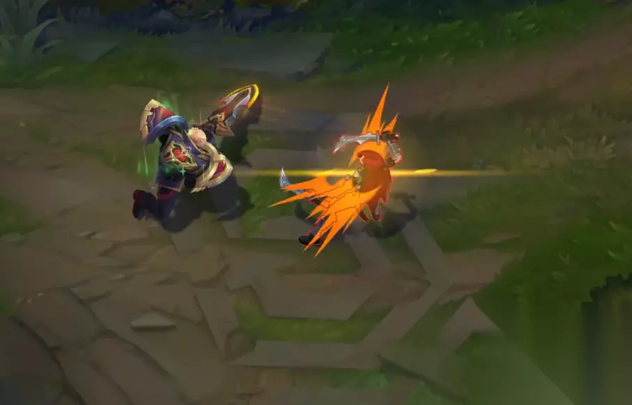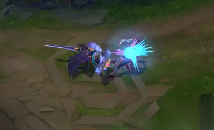 打击到敌方身上的打击特效是蓝紫色的十字星,但是星星的效果比较大,没有凯瑟琳的那么小。 3、盖伦——战斗学院 盖伦的平A特效是很漫画风格的打击效果,打击感也很带感。