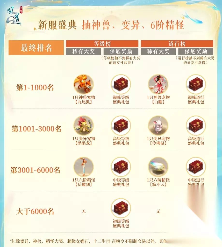 新服盛典: 冲上等级榜和道行榜,有几率被抽送指定神兽、指定变异、指定六阶精怪!