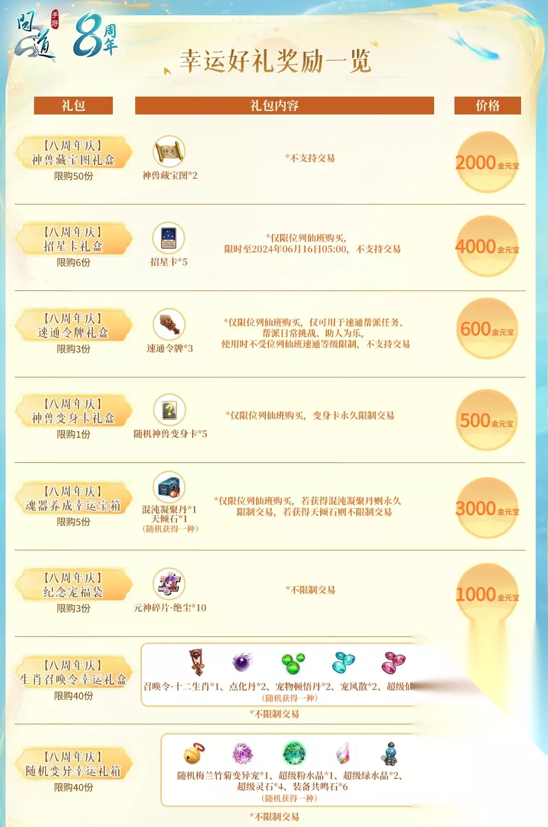 所有活动信息总览 *以下配图均为测试环境截图,请以游戏内实际上线为准! 8周年专属活动 幸运好礼: 预售阶段支付定金,开服后支付完尾款可获得礼包,能买到神兽藏宝图、速通令牌、招星卡等珍稀道具!