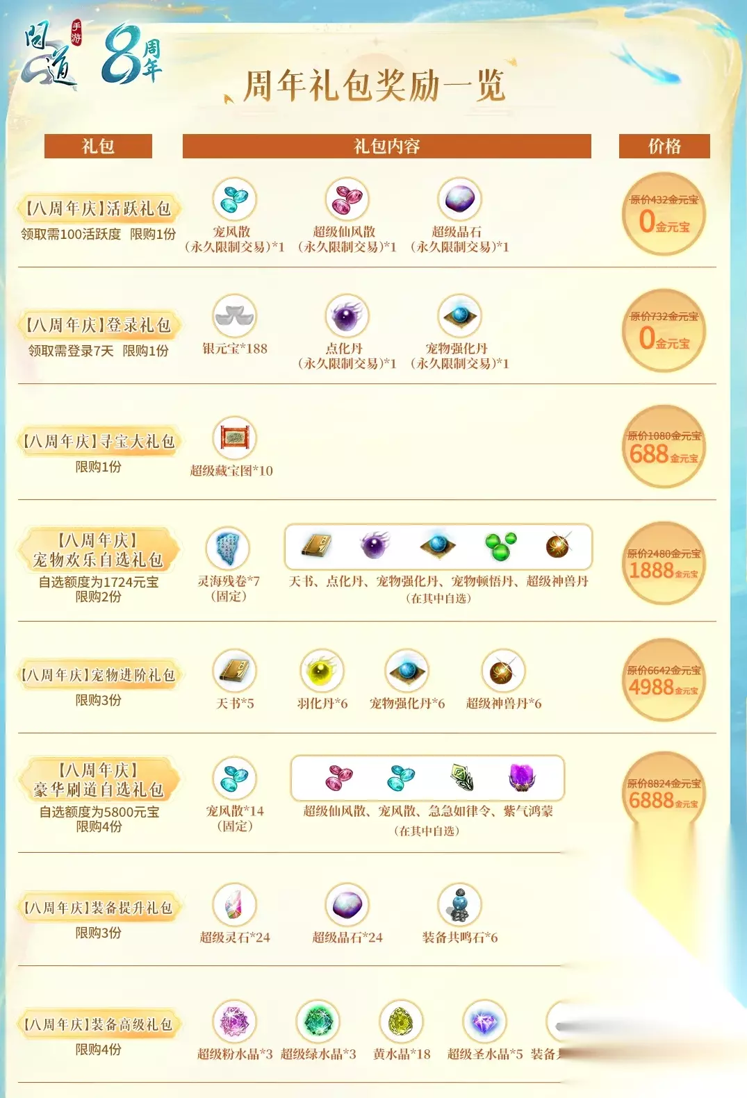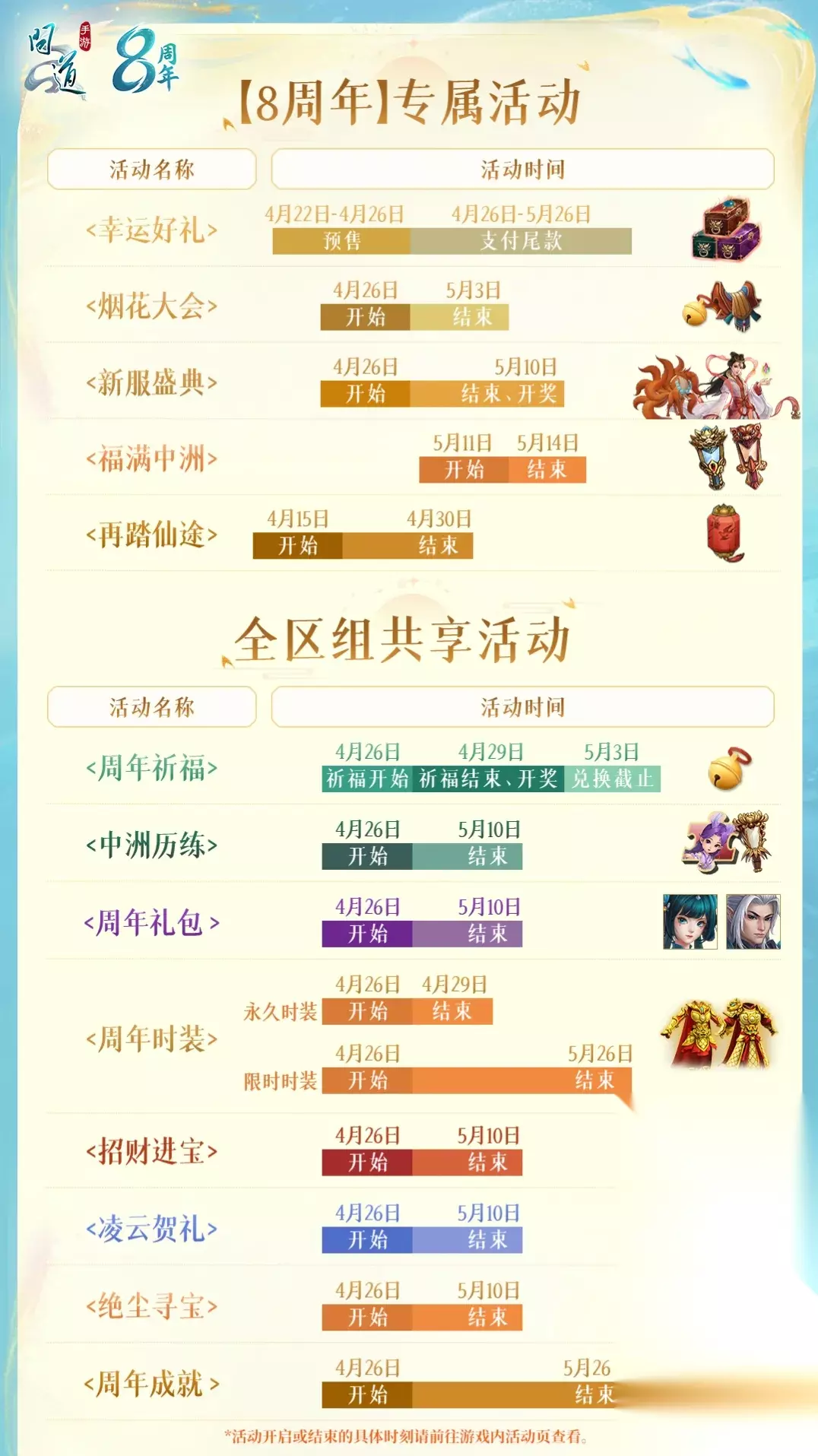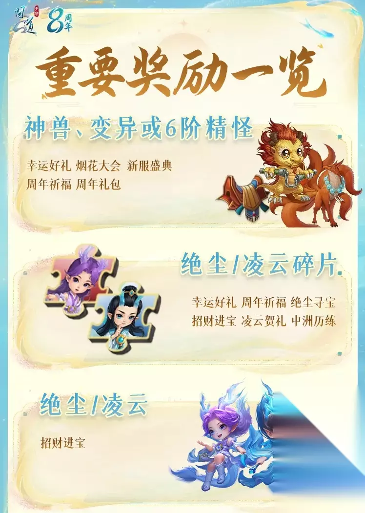 法宝开启条件: ①本区组开服后第二年开服日当天的05:00,区组会开放法宝封印功能; ②区组开放法宝封印功能,且个人角色等级≥79,个人开放法宝封印功能。 符合条件的道友记得去找多宝道人开启功能~ 8周年游戏内活动攻略 重点奖励一览 周年活动一如既往的多,所以首先给大家划个重点 !方便大家根据自己关心的奖励,精准寻找对应的活动~道友们关心的奖励在这些活动里